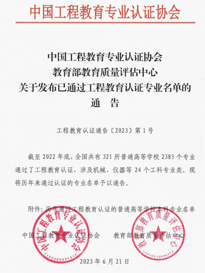(本网讯 通讯员 唐宁路)6月27日,教育部高等教育司转发了《中国工程教育专业认证协会 教育部教育质量评估中心关于发布已通过工程教育认证专业名单的通告》(工程教育认证通告[2023]第1号)。