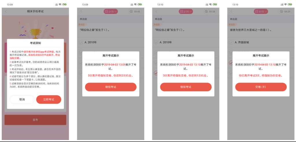 随后讲了考试发布,即如何安排考试时间??际约嗫毓讨凶钪匾氖窍呱峡际匀绾畏乐寡鞅祝⒉伎际钥梢陨柚醚目际苑绞?,例如手机考试勾选异常监控,那么学生退出考试界面系统就会自动弹出提醒,如果超出老师设置的异常监控次数,系统会强制学生交卷。