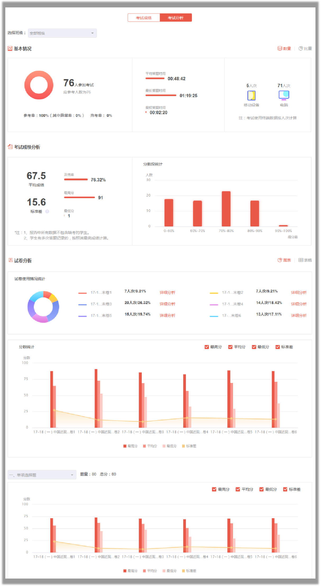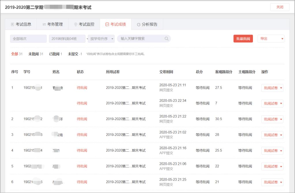 最后是试卷的批阅分析。对老师来说试卷的批阅也是一个很重要的部分,考试客观题系统批阅,主观题由老师手动批阅,合理地应用批量批阅大大减轻了老师们的负担。