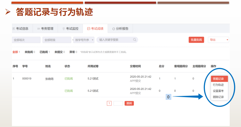 张晓萌老师还指出了通过行为轨迹判断学生是否有作弊嫌疑等,对于高度怀疑的考试行为可以请优学院的技术人员在后台调取行为轨迹进行排查,查到该学生在后台上网的网段和进入考试和提交考试的时间。