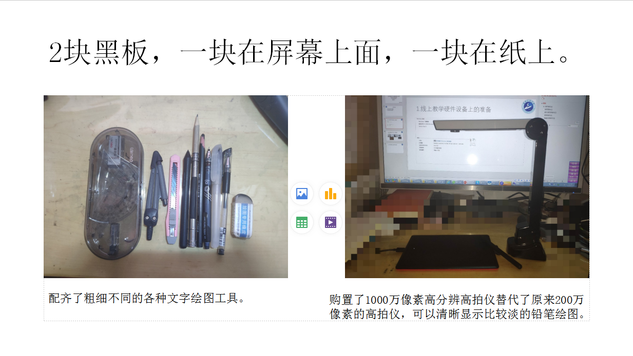 秦襄培老师首先以自己的授课经历向我们介绍了他的教学硬件设备上的准备。较好的电脑配置和网络环境,辅助线上教学工具,是顺利完成线上教学的基本保证。秦老师采用了I7电脑,1050级显卡,32寸显示器等,配置了1T的固态硬盘可以安静快速录视频。准备了线上线下2块黑板,屏幕上使用word版黑板可以在课件、ppt、pdf等文档上进行批注;纸上黑板配备了各种不同粗细的文字绘图工具。为了能够清晰显示比较的铅笔绘图,还购置了1000万像素的高拍仪代替原来200万像素的高拍仪;对于麦克风和摄像头,电容麦克风信号灵敏清晰,讲课声音如实传达;Xfinity摄像头自带4麦克风阵列。触屏笔记本电脑直接进行批注。为了有更好的授课效果,秦老师不断地自己动手进行各种设备上的尝试,如用手机支架夹装小型投影仪直投PPT到桌面;引入VR技术设备、手柄式3D扫描仪等。