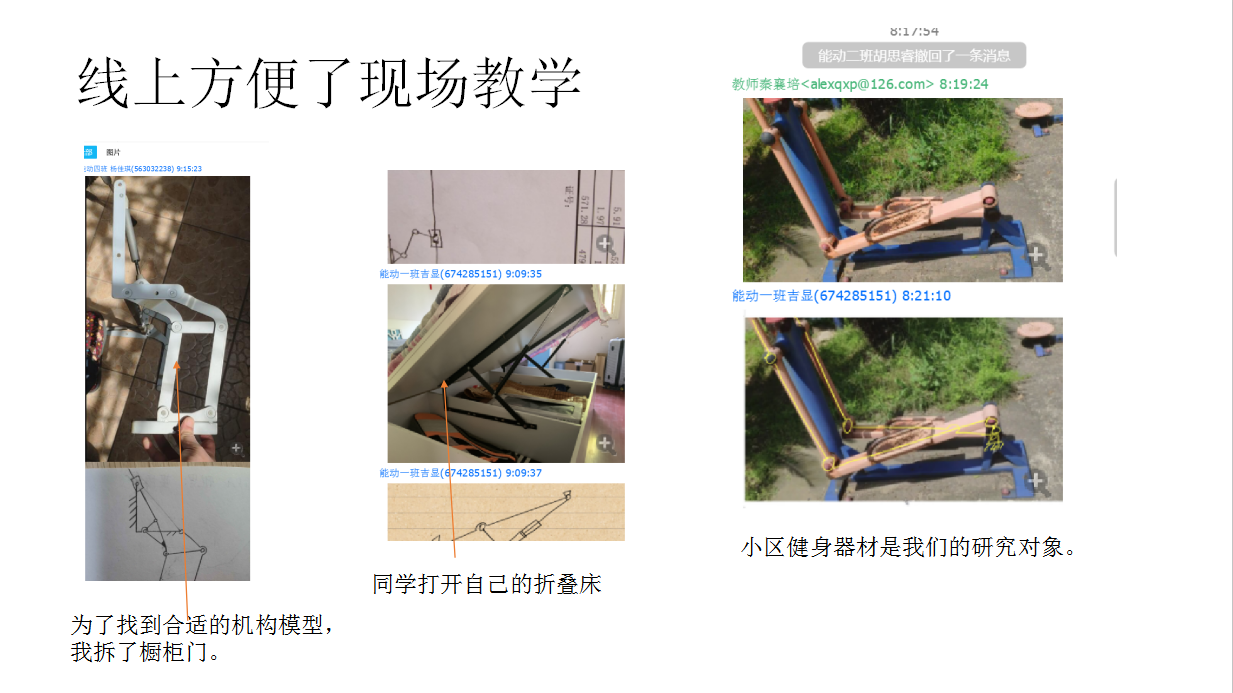 最后,秦襄培老师和我们分享了线上教学的优势。一是利用游戏吸引学生的高互动性,高参与性。线上教学更加方便设计互动环节的内容,方便学生参与。二是可以广泛利用身边户内户外器材案例方便了现场教学。为了找到合适的机构模型,秦老师拆了橱柜门;同学打开自己的折叠床;小区健身器材成了大家的研究对象。三是线上教学可以方便选择使用大型专业教学软件,如MATLAB,丰富教学内容,扩展学生的视野。四是展现广阔的网络学习世界,充分利用网络上丰富的学习资源自学。五是线上沟通便捷,可以快速响应学生的问题。个别辅导作业,从个别中找到普遍问题,提高授课内容针对性。对于老师来说,通过线上教学的录播回放可以及时发现不足之处并加以改正提升;对于学生来说,对于线上没有听懂的问题,可以自己观看回放、反复琢磨、利于学习。构建了讲课,自学,辅导的立体教学体系。