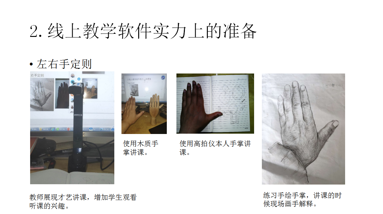 其次是线上教学软件实力上的准备,这里的软件实力包括老师个人实力和软件实力。秦老师为学生推荐优质的网络资源。解释左右手定则的时候练习手绘手掌、运用木制手掌、使用高拍仪本人手掌等;还运用手绘讲解机构运动简图,四杆机构,运动分析,自由度计算问题,吸引学生观看听课的兴趣;使用excel和MATLAB等软件解决机械问题,教导学生举一反三。为了方便学生自学,列出自学知识点清单,明确学习目标;在讲课的时候,注意结构课本的体系化知识,用基本知识单元重构符合学生认知的学习步骤;除了知识的横向展开,还注意知识的前后沟通;构建讲课,自学,辅导立体教学体系。线上教学方便师生互动,设置知识点问题,引导学生现场思考解决,运用斗鱼直播,腾讯QQ群课堂等平台交互吸引学生在线学习。