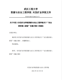 本网讯(通讯员 郑浩然)为认真贯彻习近平总书记关于教育和安全的重要讲话精神,全面落实全国高校思想政治工作会精神,加强学院课程思政建设和安全工作,武汉工程大学资源与安全工程学院结合学校和学院的实际情况,成立安全教育嵌入课堂工作小组,本学期在全院开始实施“安全教育嵌入课堂”制度,精心打造课程思政品牌。