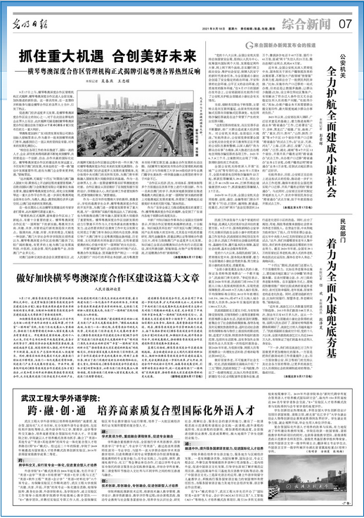 本网讯(通讯员 张艳梅 付艳锋)9月18日,《光明日报》刊登我校外语学院陈明芳、凃朝莲、张艳梅署名文章:《武汉工程大学外语学院:跨·融·创·通 培养高素质复合型国际化外语人才》,报道我校外语学院“跨·融·创·通”培养高素质复合型国际化语言人才的教育教学研究经验,以及全面深化人才培养创新模式改革取得的显著育人成效。