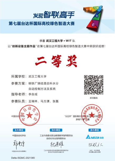 窗体顶端窗体底端 7月24日-25日,由中国自动化学会主办,台达集团承办的自动化领域的绿色创新型科技竞赛—第七届“台达杯”国际高校绿色智造大赛圆满落幕。我校电气信息学院王瑞林、马方潇、张磊三位同学组成的“WIT队”(参赛作品:钢铁厂烧结混合料水分自动控制方法及系统)在大赛总决赛中荣获二等奖。